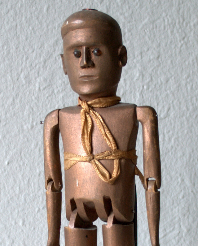 Early 20th century folk art carved articulated figure with a bronze paint finish and an almost robot-like appearance.